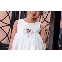 Το petit πουά soft touch τούλι συνδυάζεται άριστα με γαλλικές δαντέλες άριστης ποιότητας. Το ρούχο το στολίζουν degrate handmade λουλούδια. Αξεσουάρ η κορδέλα για το κεφάλι.