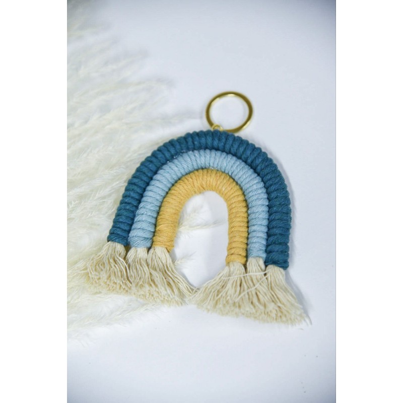 Μακραμέ ουράνιο τόξο σε αποχρώσεις μπλε και κίτρινο με μπέζ βάση.